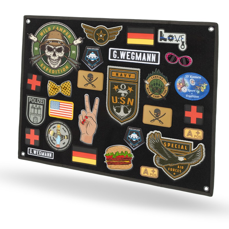 - High-quality material - This Velcro mat is foldable and is made of soft fleece on the front for easy attachment of your patch to the Velcro surface. Even heavy patches hold without any problems. The durable nylon fabric on the back with reinforced metal eyelets for hanging the Velcro wall patches