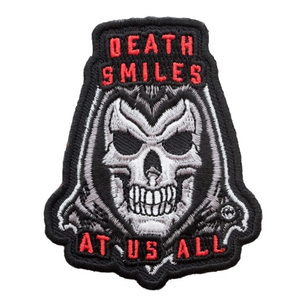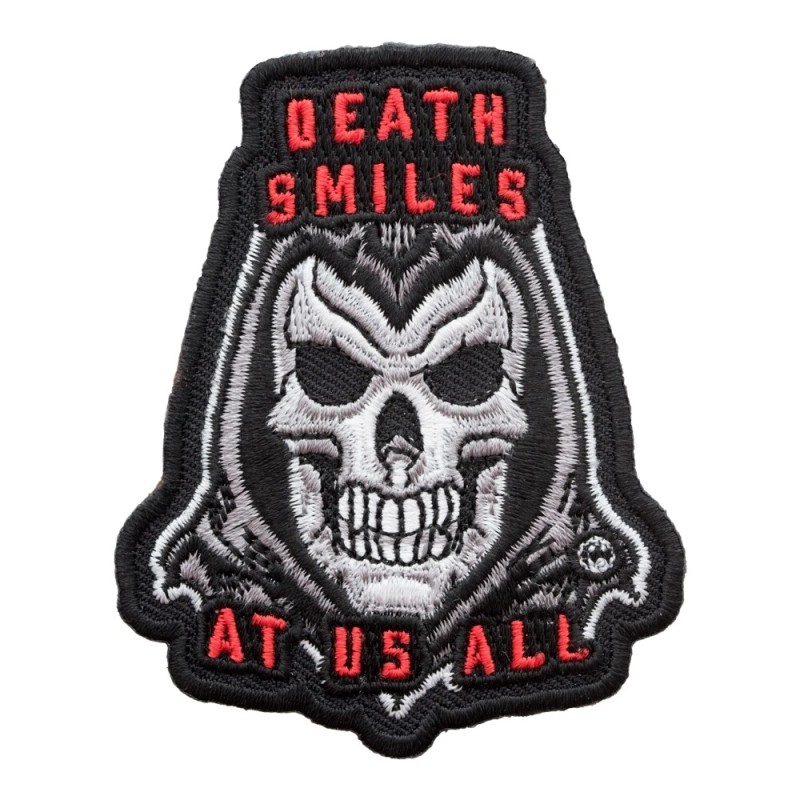 - This Death Smiles At Us All Grim Reaper patch measures 2.5" W x 3" H (6.4cm x 7.6cm)