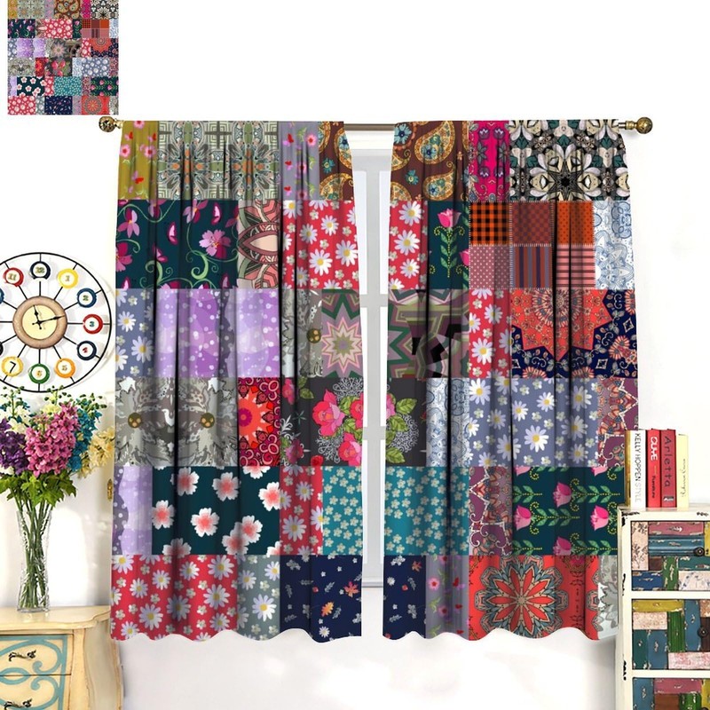 Patchwork Curtains, Hippie Patchwork Pattern Flowers Window Treatments, Retro Rod Pocket Thermal Insulation Drapes for Bedroom Living Room Kitchen, 42" W X 45" L