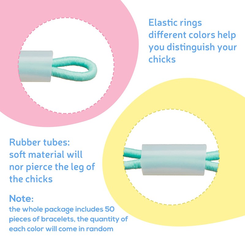 - Package includes: the package includes 50 pieces of elastic rings in different colors and 50 pieces of rubber tubes, both are soft and can help you distinguish your chicks