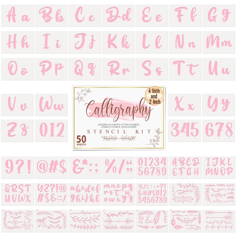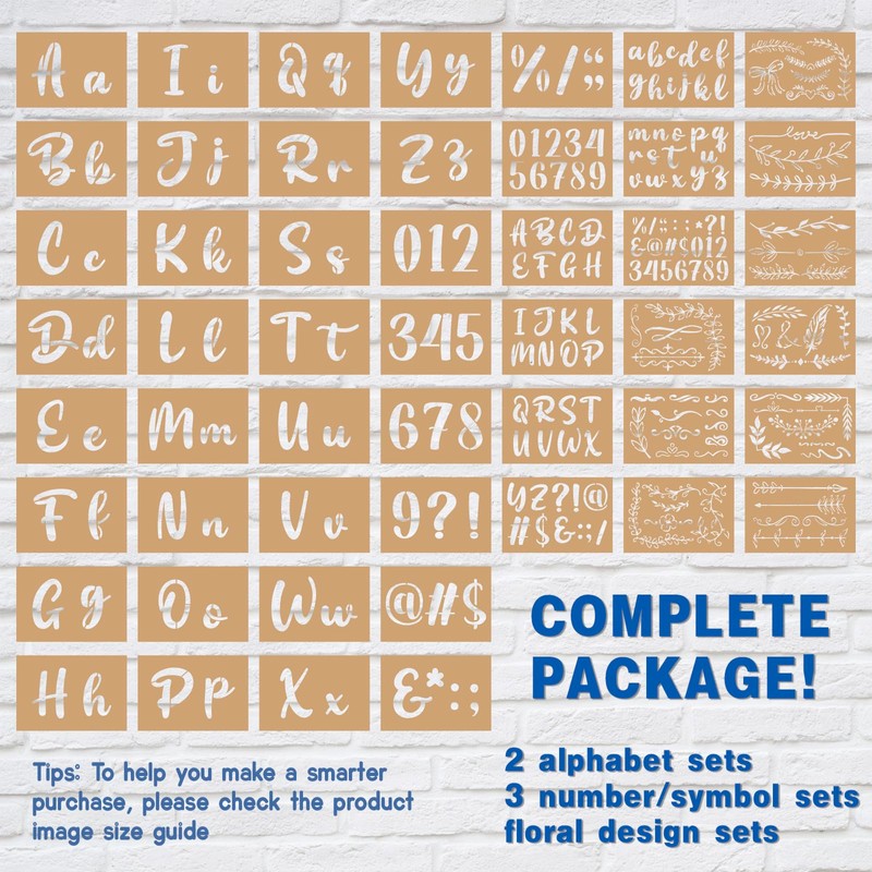 - [COMPLETE PAINTING LETTER TEMPLATE SET] - Calligraphy Stencil Kit includes 2 complete letter stencil sets (large 4 inches and small 2 inches) including uppercase and lowercase letters, numbers, common symbols and beautiful floral designs. The package contains a total of 50 letter pattern templates