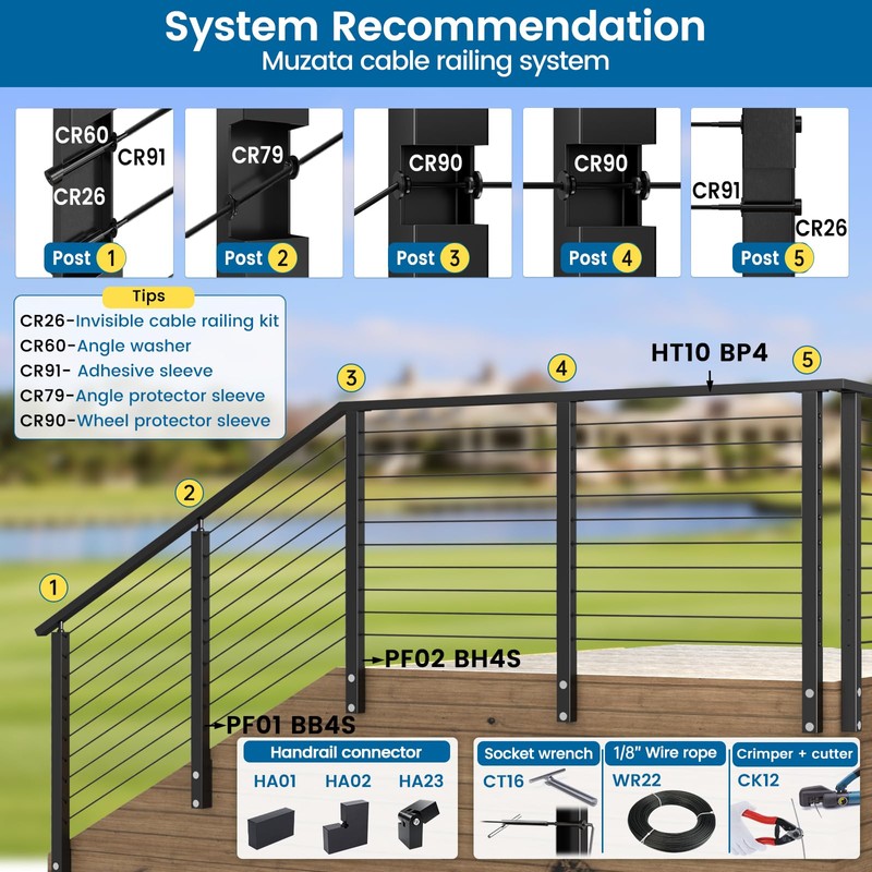 - Advice for constructing a system: To help you build a cost-effective BlackCool cable railing system more efficiently, we recommend the following product combinations from Muzata, including post (PS01-angle top, PS02-flat top), handrail(HT10), cable railing kit CR26 and CR07, angled washer CR60, wire rope WR17, protector sleeve CR90, adhesive sleeve CR91, crimper and cutter CT01, socket wrench CT16, handrail connnector(HA01 HA02 HA23 HA24)
