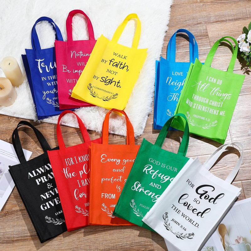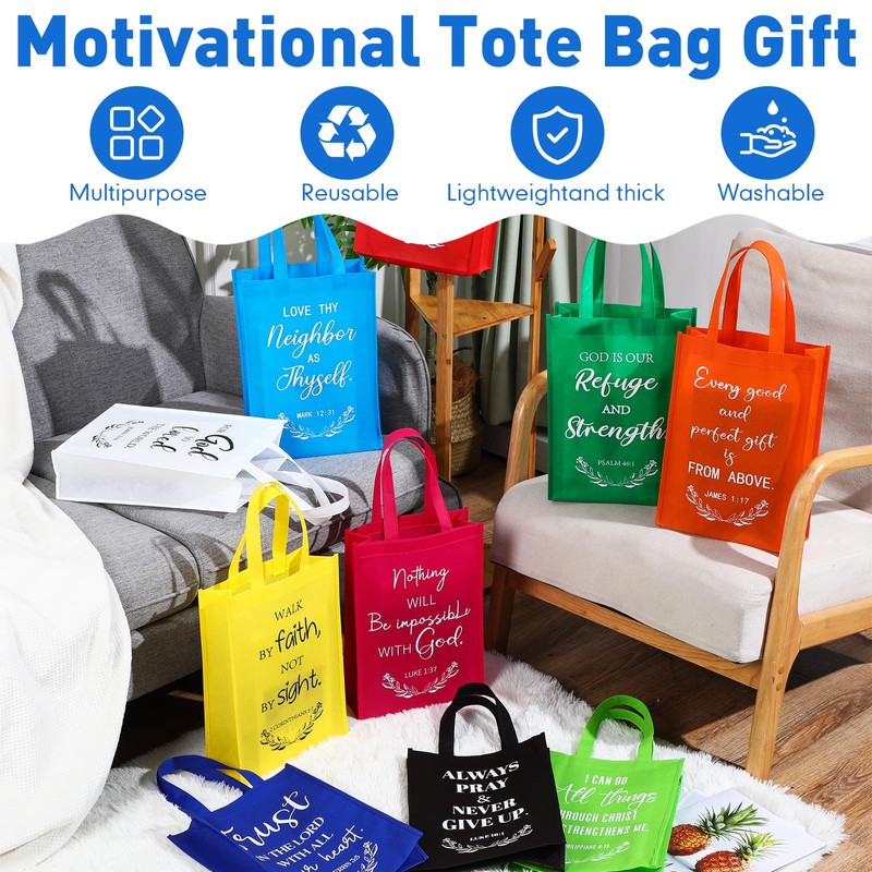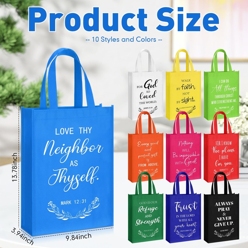 - Product Content: our christian gift bags come in ten colors: red, orange, yellow, green, blue, dark green, rose and purple, black and white, with 10 different christian inspirational quotes, 3 of each style, for a total of 30 pieces; Whether you're gifting to a small congregation, or attending a christian family gathering, this bulk pack has got you covered