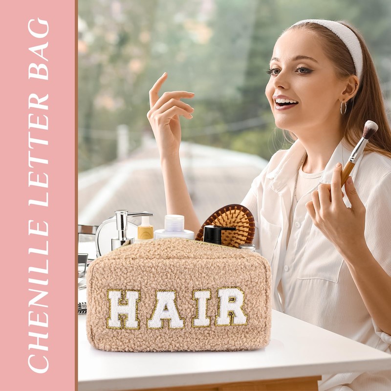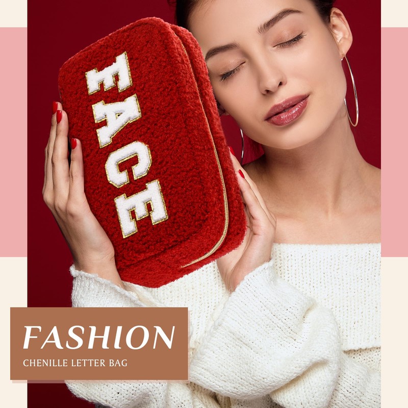 - Diseño de letras de chenilla brillantes: esta bolsa de maquillaje presenta un diseño novedoso y llamativo con letras de chenilla brillantes, que agregan un toque de glamour a su rutina diaria de maquillaje, las letras brillan y captan la luz, dándole un aspecto impresionante y lujoso