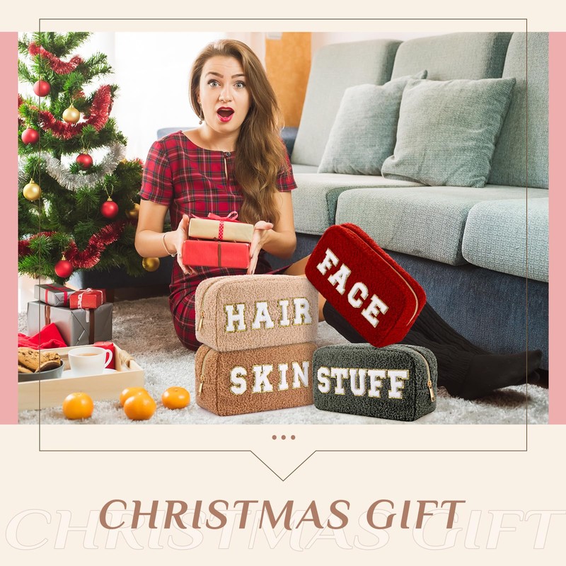 Paterr 4 Bolsas de Maquillaje con Parches Fresas de Letras de Chenilla de Navidad Bolsa de Maquillaje de Felpa de Hair Skin Face Stuff Neceser de Cosméticos Grande con Cremallera (Color Rojo Verde)