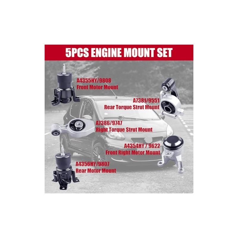 High-Performance Engine Motor Mount Kit (5PCS) for Nissan 3.5L V6This complete motor mount set ensures stable engine positioning and reduces vibrations for your Nissan Altima, Maxima, or Pathfinder. Designed to meet or exceed OEM specifications for a perfect fit and reliable performance.2013-2018 Nissan Altima Exclusive 3.5 6 V2013-2015 Nissan Altima S 3.5 6 V2013-2018 Nissan Altima SL 3.5 6 V2016-2018 Nissan Altima SR 3.5 6 V2013-2015 Nissan Altima SV 3.5 6 V2021 Nissan Maxima 40th Anniversary Edition 3.5 6 V2016-2020 Nissan Maxima Advance 3.5 6 V2016-2020 Nissan Maxima Exclusive 3.5 6 V2016-2023 Nissan Maxima Platinum 3.5 6 V2020 Nissan Maxima Platinum Reserve 3.5 6 V2016-2020 Nissan Maxima S 3.5 6 V2016-2023 Nissan Maxima SL 3.5 6 V2016-2023 Nissan Maxima SR 3.5 6 V2016-2023 Nissan Maxima SV 3.5 6 V2017-2020 Nissan Pathfinder Advance 3.5 6 V2017-2020 Nissan Pathfinder Exclusive 3.5 6 V2017-2020 Nissan Pathfinder Platinum 3.5 6 V2017-2020 Nissan Pathfinder S 3.5 6 V2017-2020 Nissan Pathfinder Sense 3.5 6 V2017-2020 Nissan Pathfinder SL 3.5 6 V2017-2020 Nissan Pathfinder SV 3.5 6 VKey Features:5-Piece Full Set covers all critical mounting pointsHeavy-duty rubber and steel constructionOEM replacement qualityReduces noise and vibrationPackage Includes:5x Engine Motor Mounts