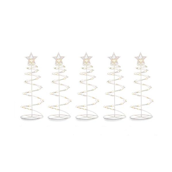 Enchant your home in adorable style with these lovely light-up Christmas trees! Constructed with its outward spiral design and glowing mini lights, the five trees feature luminous stars on a thin white stake. This set is perfect for decoration throughout your yard, garden or along a walkway.