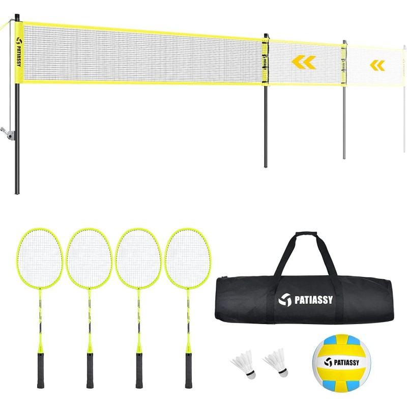 Patiassy Professional Volleyball Badminton Combo Set Net w/Net Adjustable Poles 4 Rackets