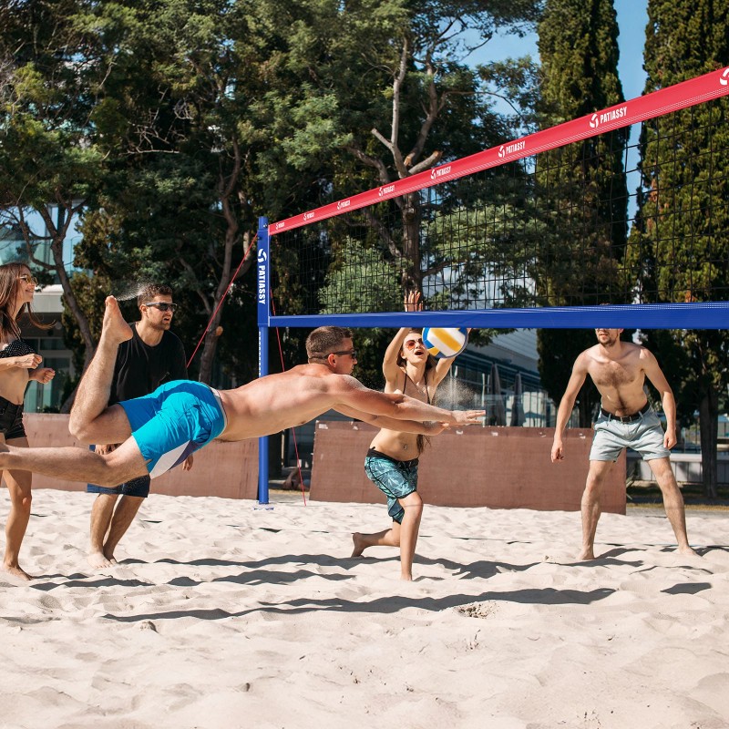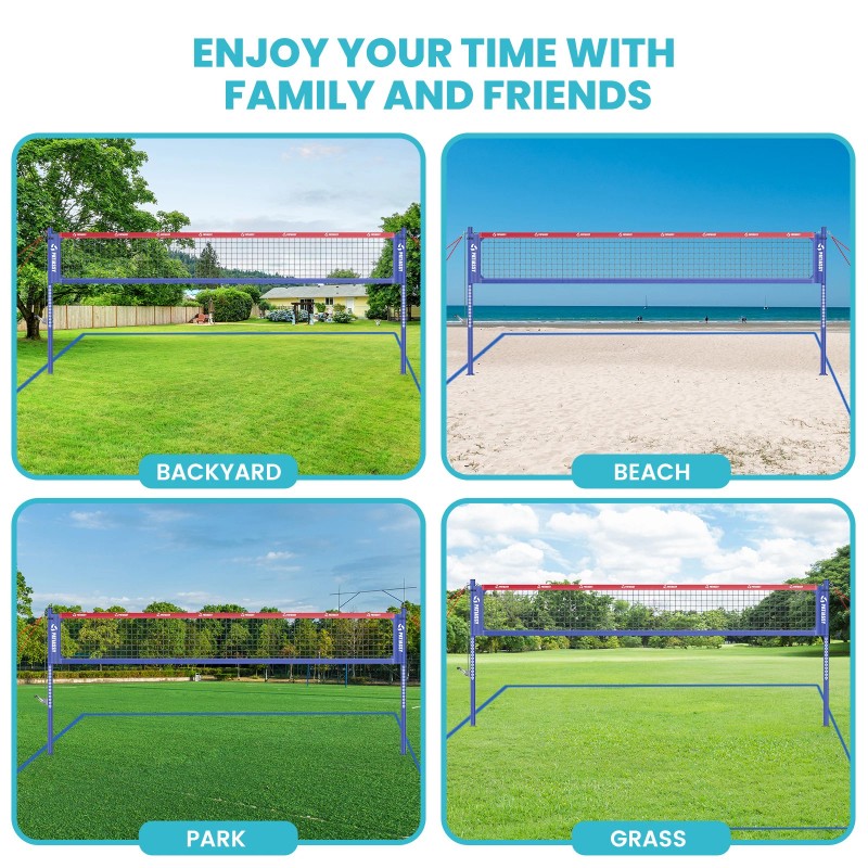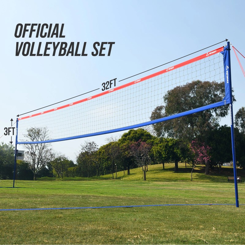 High-Visibility and Durable Net--The 32'L x 3'H volleyball net is made from 21-layer PE material, tear-resistant, and perfect for all levels of play. It includes reinforced corners, 5" side sleeves, and 3" top and bottom tapes to ensure even tension and durability