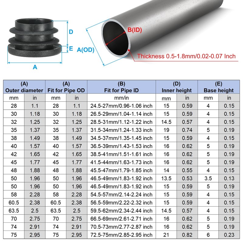 - Color: Black; Material: PE; Size: 32x17mm/1.25x0.66inch(L*H); Thickness: 4mm/0.15 inch; Fit for Inside diameter of 28.5-31mm/1.12-1.22 inch tubing; Packing List: 24Pcs x Plastic End Caps