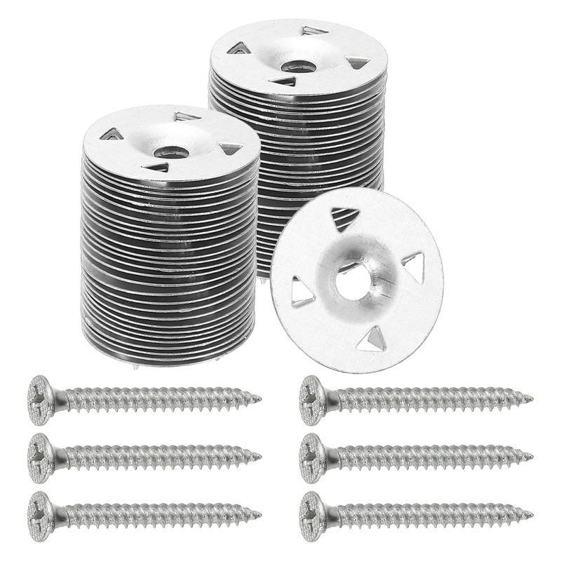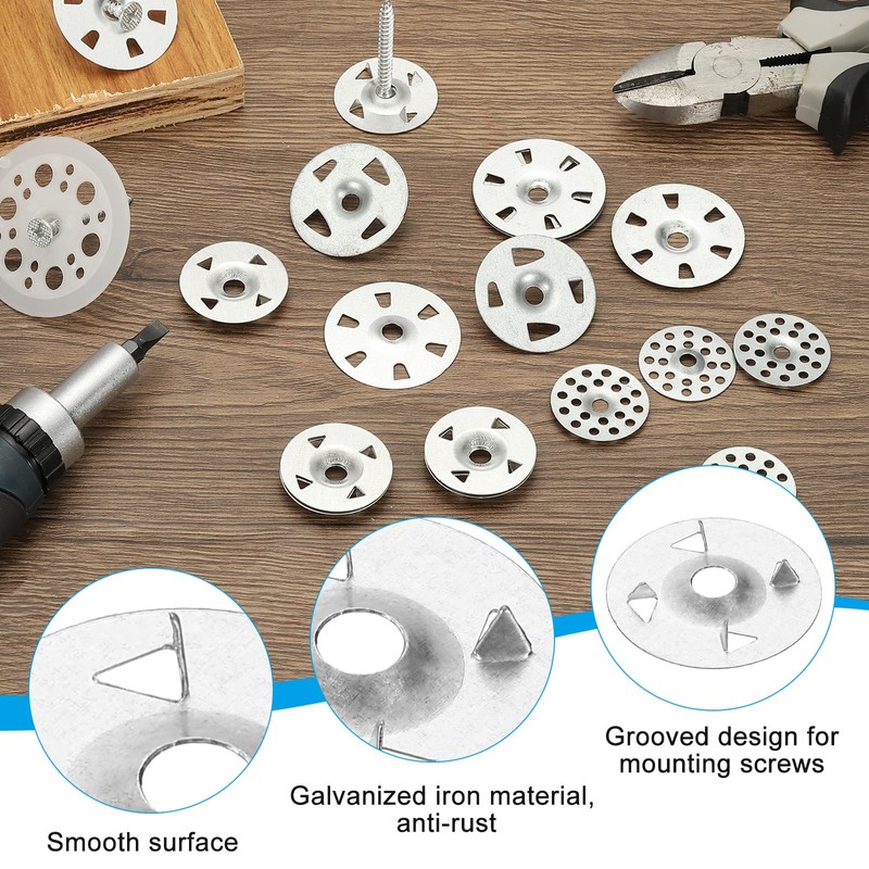- SIZE: The foam board fasteners are 28 mm / 1-1/8 inch in diameter and the center hole is 5mm; you will get 100PCS metal insulation washers and 100pcs screws, enough for your daily replacement and use for foam board insulation and other repairs.