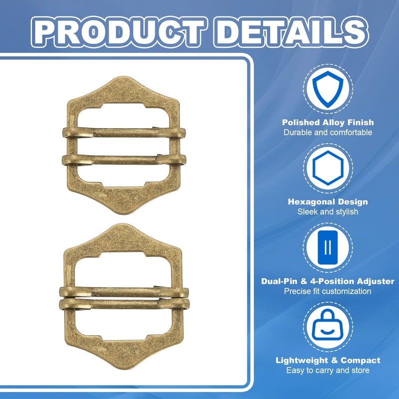 - Advantage: Made from alloy for strength and durability, this buckle combines a sleek hexagonal design with a double-pin mechanism and a 4-position slide adjuster for precise fit adjustments. Its compact, lightweight build ensures easy storage, while the smooth, polished finish offers comfort and a seamless user experience.