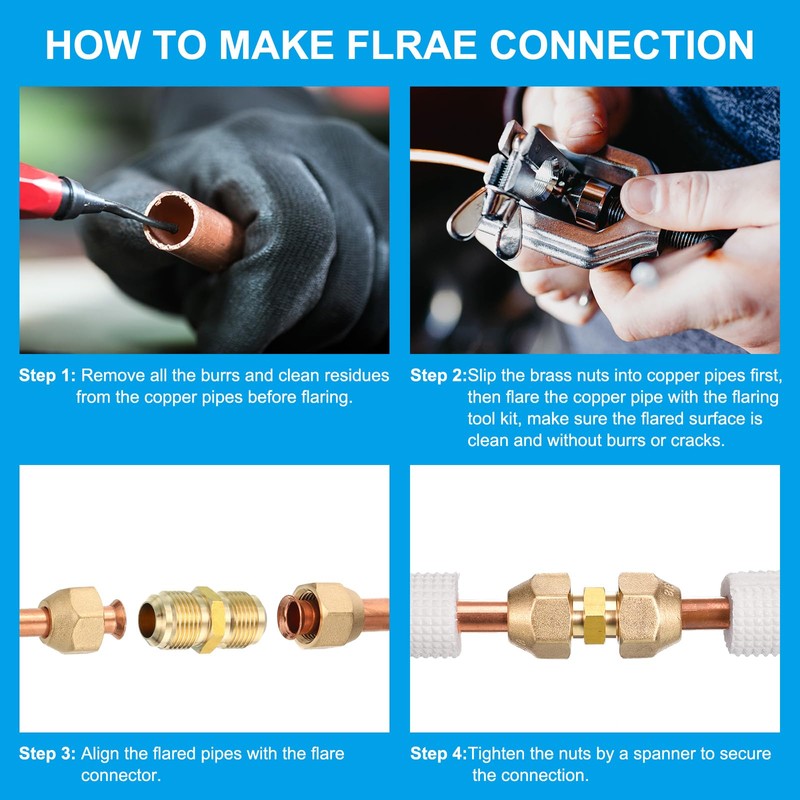 - Application: The AC pipe extension joint connector is designed to connect and extend copper pipes without welding, allows you to make sound and solid connections between two copper pipes simply by a wrench. With two sizes on ends, it is specifically used for copper pipe diameter increasing and reducing.This flare fitting is widely used in mini-split air conditioning system, heat pump system, refrigeration, HVAC, fuel and gas system, plumbing, and vacuum applications.