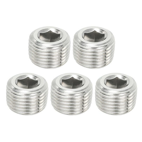 PATIKIL 1/2NPT Male Pipe Plug Internal Hex Thread Socket, 5 Pcs Solid Stainless Steel Pipe Plug Fitting Set Hex Counter Sunk Pipe Plug for Pipe Air Tanks, Silver
