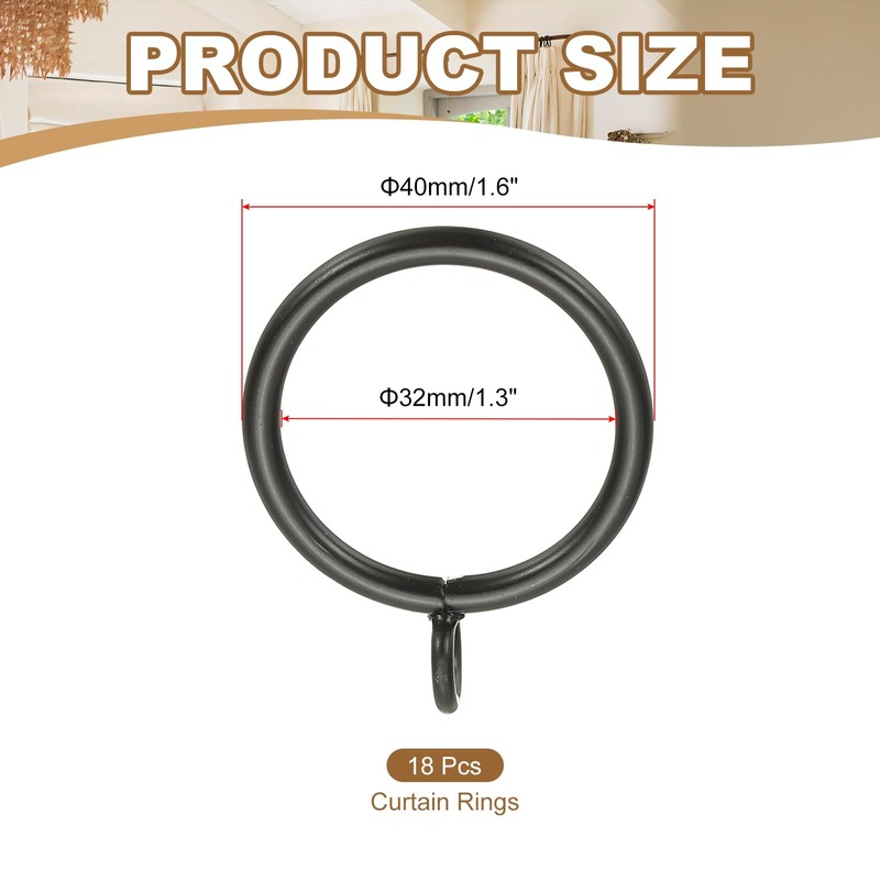 - Specification: Inner diameter is 1.3"/32mm, Outer diameter is 1.6"/40mm, Material: Metal, Color: Black, 18 Pcs x Curtain Rings