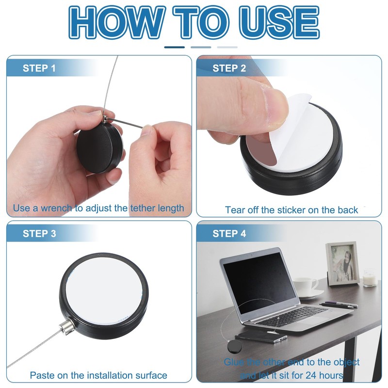 - Instruction: Peel off the backing to secure the plate to a hard surface of your device and attach one end of the tether to the remote; Gently pull to extend the tether; After use, release the tension to retract the tether and safely store the remote