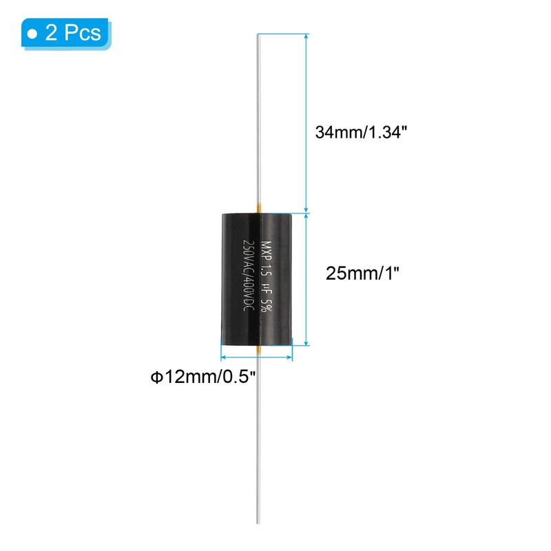 - Specification: Capacitance: 1.5uF; Rated Voltage: 250AC/400DC V; Capacity Deviation: ±5%; Size:25x12mm/1x0.5 inch; Pin length: 34mm/1.34 inch; Lead Type: Axial 2 Pins; Color:Black; Packing List:2 Pcs CBB20 Capacitors