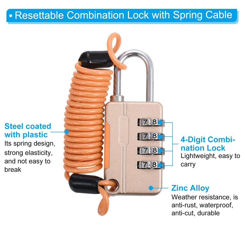 - Advantage: The padlock is made of zinc alloy material, has good weather resistance, is anti-rust, waterproof, anti-cut, durable, and does not easy to fade after long-term use. Plastic-coated steel cable can be anti-rust and anti-scratch, its spring design, strong elasticity, and not easy to break. 4-digit combination lock, it can provide some groups of passwords to choose from, with high security and strong anti-theft performance. Keyless design, small size, lightweight, easy to carry.
