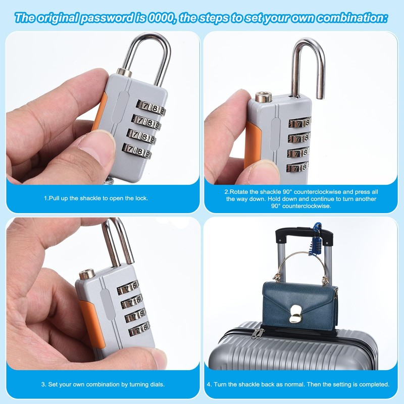 - Instruction: The original password is 0000, the steps to set your own combination: 1. Pull up the shackle to open the lock. 2. Rotate the shackle 90° counterclockwise and press all the way down. Hold down and continue to turn another 90° counterclockwise. 3. Set your own combination by turning dials. 4. Turn the shackle back as normal. Then the setting is completed.