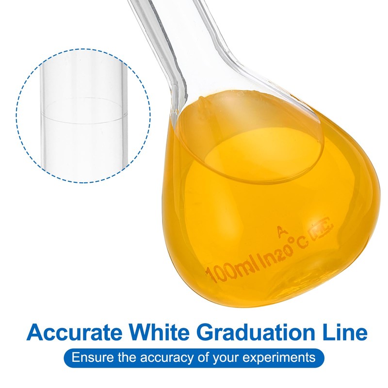 - Advantage: The volumetric flask and the stopper are made of low expansion coefficient thickened borosilicate glass which can resist high and low temperatures and has superior chemical durability; The bottle mouth has a glass stopper to reduce evaporation and prevent liquid leakage. The long neck shape is convenient for holding and shaking to mix liquid; The transparent bottle body and accurate white graduation line ensure the accuracy of your experiments.