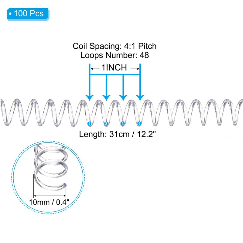 - Specification: Inner diameter: 10mm/0.4 inch; Length: 31cm/12.2 inch; Coil spacing: 4:1; Number of binding pages: 75; Material: plastic Color: Transparent; Packing List: 100 Pcs Plastic Spiral Binding Coils