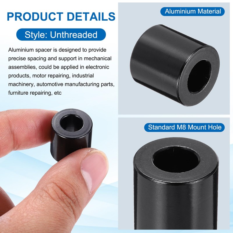 • Aluminum Spacer: Size: 8.2 x 16 x 16 mm / 5/16 x 5/8 x 5/8 inch (ID x OD x L); Material: Aluminium; Applicable Screw Size: M8; Style: Unthreaded; Color: Black; In the package of: 10 Pcs x Unthreaded Metal Spacer