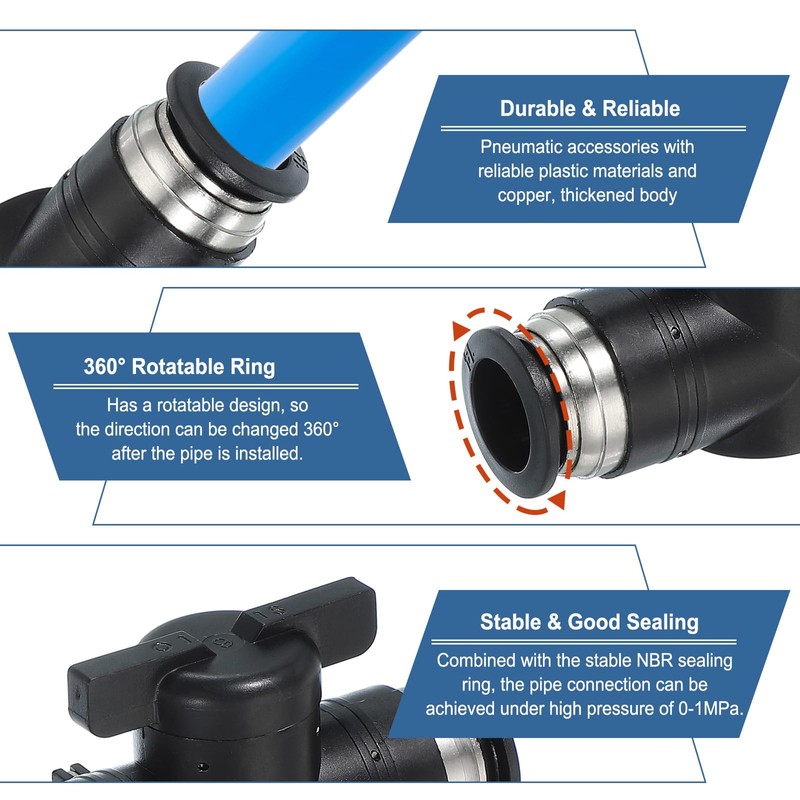 Pneumatic accessories with reliable plastic materials and copper, thickened body, durable and reliable; design with full environment fit, firm structure, effectively prevent air leakage;