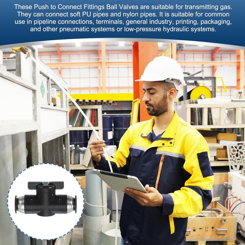 - APPLICATION These push to connect fittings ball valves are suitable for the transfer of gas. You can connect soft PU pipes and nylon pipes. They are suitable for use in pipe joints, connections, general industry, printing, packaging and other pneumatic systems or low pressure hydraulic systems.