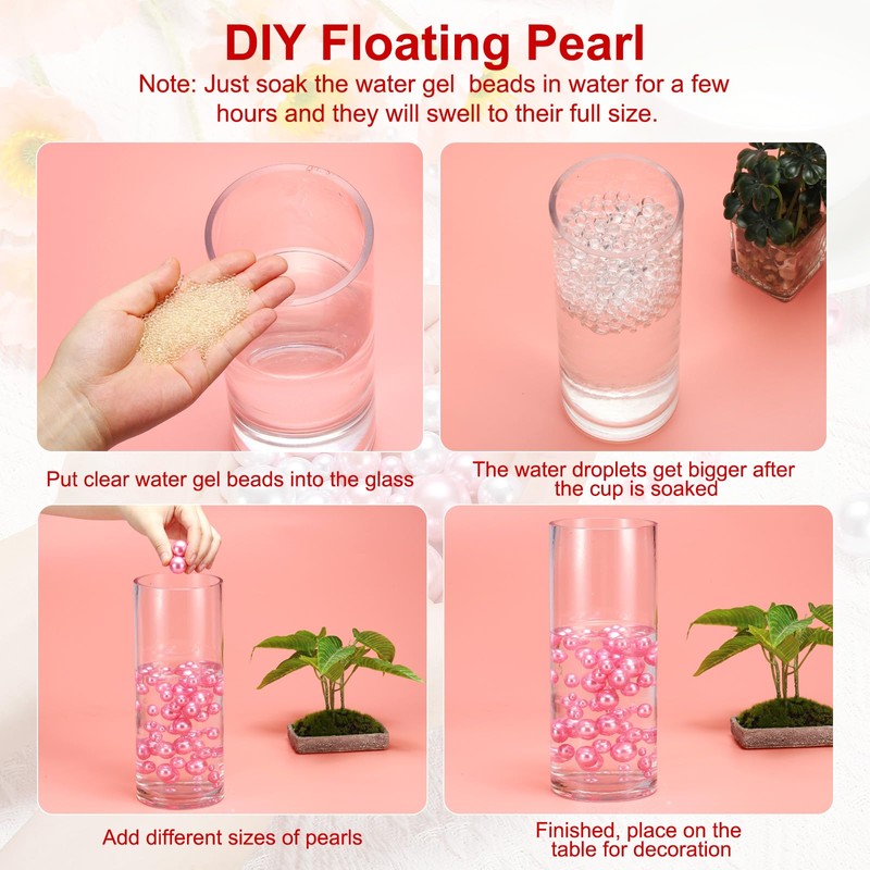 Water Gel Beads: The floating beads expand when soaked in water to form clear, floating gel beads, which when paired with the colored water beads used for vase fillers, create an amazing floating effect. (No hole vase pearls will not float in water, you need to use clear water gel beads to float them.)