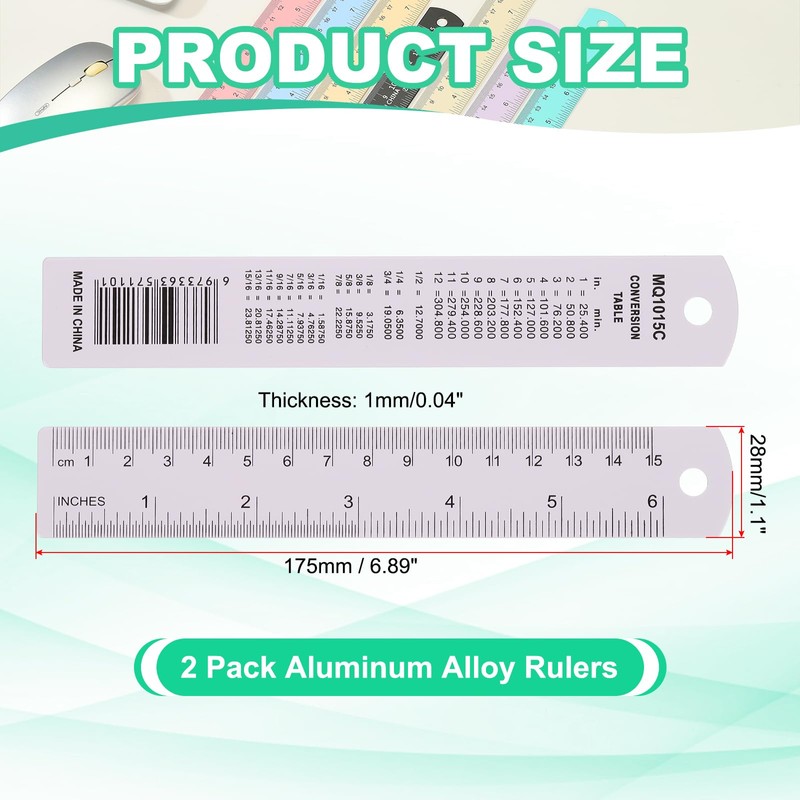 - Specification: Color: Purple; Material: Aluminum Alloy; Mileage: 15cm/6"; Total Length: 175mm / 6.89 inch; Width*Thickness: 28 x 1mm / 1.1 x 0.04 inch; Packing List: 2 Pack x Aluminum Alloy Rulers