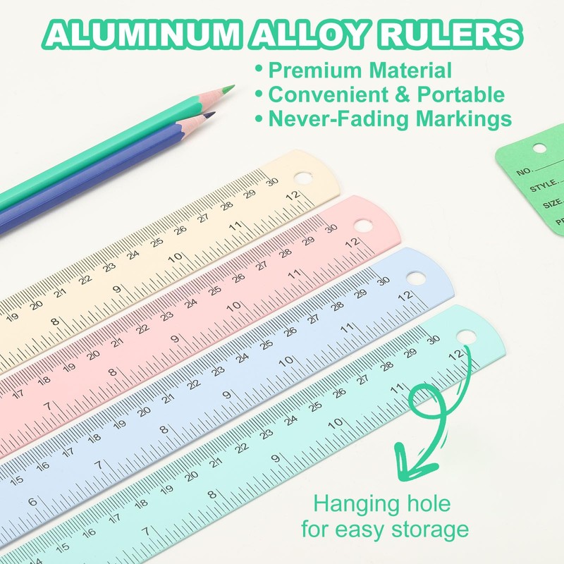 - Advantage: Made of quality aluminum alloy material, ensuring durability, rust resistance, and long-lasting use; Convenient design with rounded and smooth edges, hanging hole for easy storage, and compact size for portability. Laser etched and black anodized scales for bold, and never-fading markings; Double-sided markers with both inch and centimeter graduations, including a conversion table.
