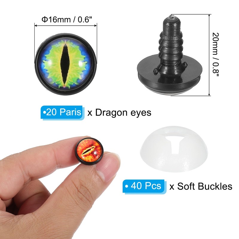 - Specification: Size:16 x 20 mm/0.6 x 0.8 Inch(W*H); Color: Green; Blue; Light Green; Orange; Yellow; Pink; Purple; Rainbow Color; Grey; Material: Plastic; Packing List: 20 Pairs x Dragon eyes; 40 Pcs x Soft Buckles,