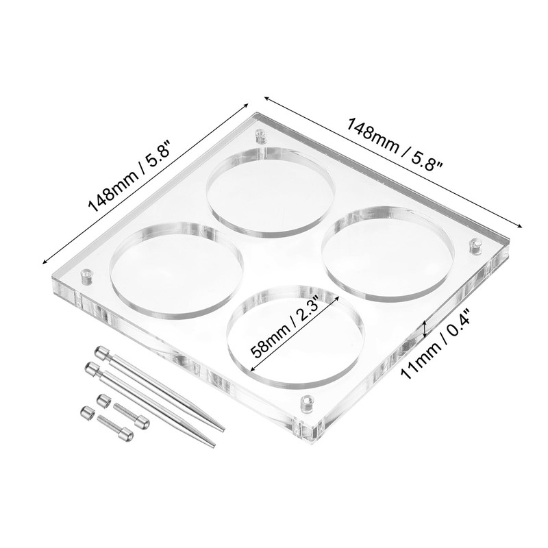 - Color: Transparent; Material: Acrylic; Suitable for Coin Size: 58mm / 2.3 inch; Size: 148 x 148 x 11mm / 5.8 x 5.8 x 0.4 inch(L*W*H); Packing List: 1 x Coin Display Holders, 4 x Mounting Screws