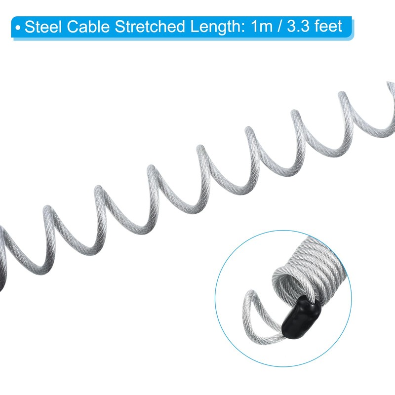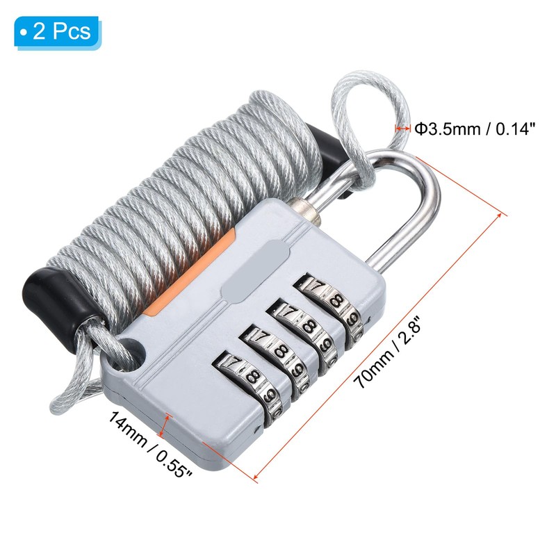 - Size: The lock steel cable stretched length is 1 m / 3.28 feet; steel cable diameter is 3.5 mm/ 0.14 inch; combination padlock length is 70 mm/ 2.76 inch; combination padlock width is 28 mm/ 1.1 inch; shackle thickness is 14 mm/ 0.55 inch; color is Grey; lock material is zinc alloy; cable material is steel; packing list is 2 x resettable combination locks