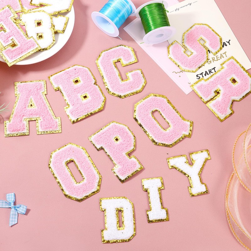 - Advantage: 1. The letter patches are crafted from intricate towel embroidery and non-woven fabric, washable. Surrounding the letters is a gold glitters embellishment that adds a bright and fashion touch to the design. 2. Chenille letter patches have heat sealant backing glue on the back, it is easy to use. You can use ironing or sew the patch directly. You can also use double-sided tape to stick directly (double-sided tape is not included)