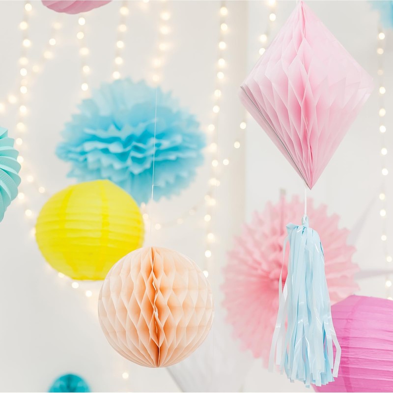 ポンポンペーパーフラワーを広げ、端をピンや粘着テープで固定し、壁や装飾したい場所に取り付けてください。