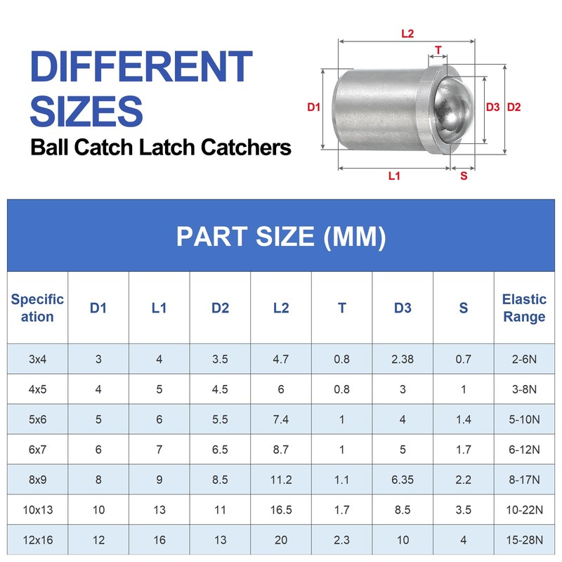 - Body Size: 4 x 5 mm / 0.15 x 0.2 inch (Dia*L); Total Size: 4.5 x 6 mm / 0.18 x 0.23 inch (Dia*L); Elasticity range: 3-8N; Packing List: 20 x Ball Catch Latch Catchers