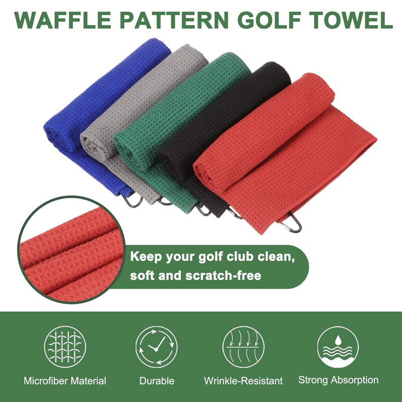 - Advantage: This tri-fold golf towel is made of microfiber material, which is super absorbent and easy to clean. Reinforced edges, no off-line. Grid texture design is thick and has no lint, is durable, and is wrinkle-resistant