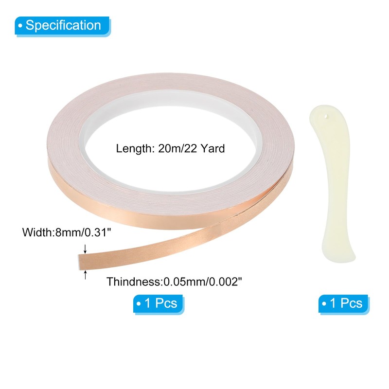- Specification: Length: 20m/22 Yard;; Width: 8mm/0.31 inch; Thindness:0.05mm/0.002 inch; Material: Single Guide Foil; Packing List: 1 Roll Copper Foil Tape, 1 Pcs Plastic Scrapers