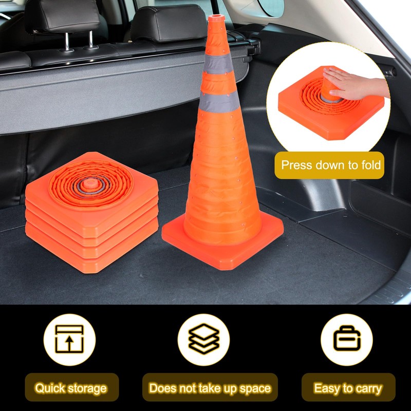 Designed for high visibility, each cone features 360-degree reflective strips and a bright orange color, making them easily noticeable both day and night, even from a distance.