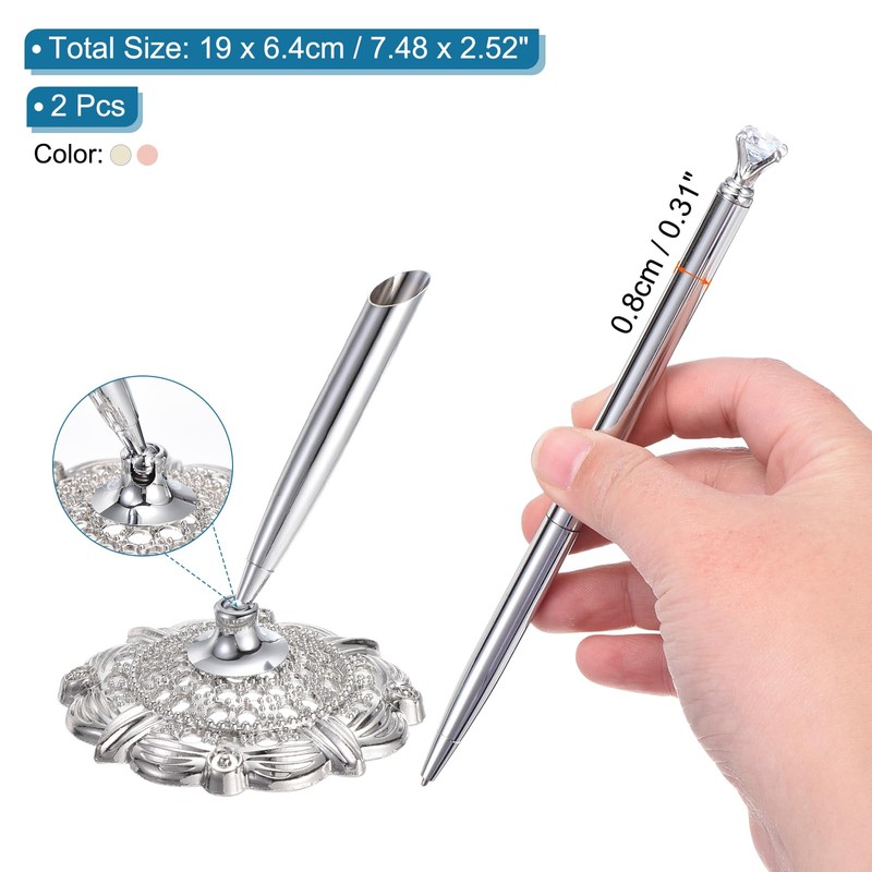 PATIKIL 2Pcs Hollow Round Pen Holder Signing Pen Set, Wedding Pen with Crystal Diamond and Pen Holder for Wedding Guests Book Engagement Opening Ceremony, Silver, Rose Gold