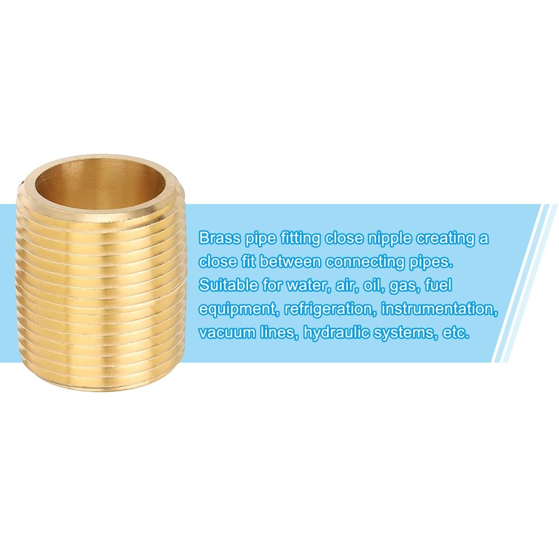 • Brass pipe fitting close nipple creating a close fit between connecting pipes. Suitable for water, air, oil, gas, fuel equipment, refrigeration, instrumentation, vacuum lines, hydraulic systems, etc.