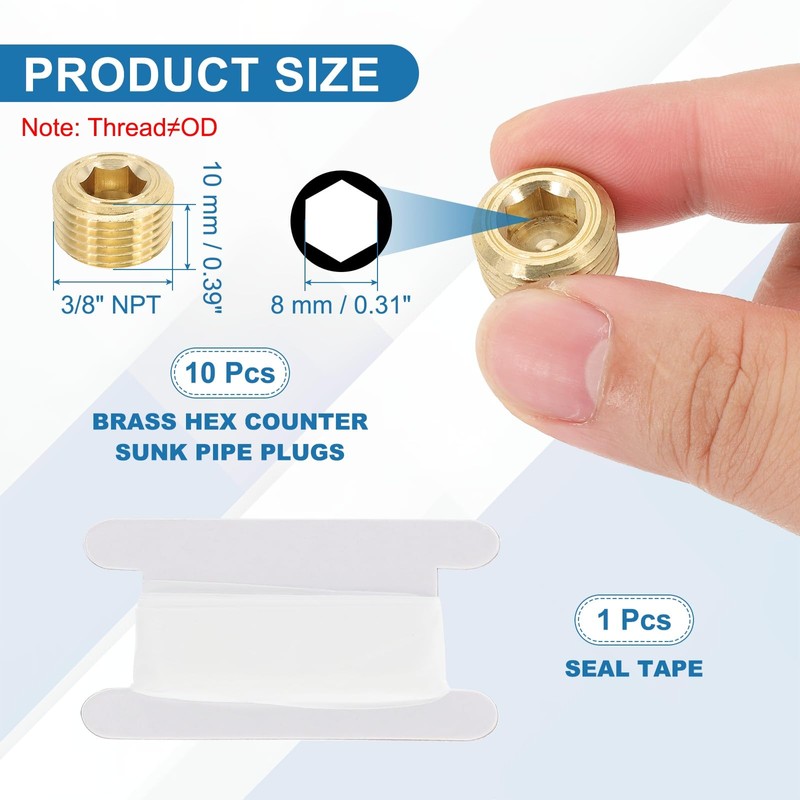 - Male Thread Size: 3/8" NPT; Thread Length : 10 mm / 0.39 inch; Internal Hex Width: 8 mm / 0.31 inch; Package List: 5 Pcs x Brass Hex Counter Sunk Pipe Plugs; 1 Pcs x Seal Tape