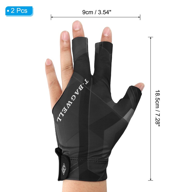 - Color: Black Grey; Material: Spandex, Polyester; Overall Size: 18.5 x 9cm / 7.28 x 3.54 inch (L*W); Packing List: 2 Pcs x 3 Fingers Pool Gloves