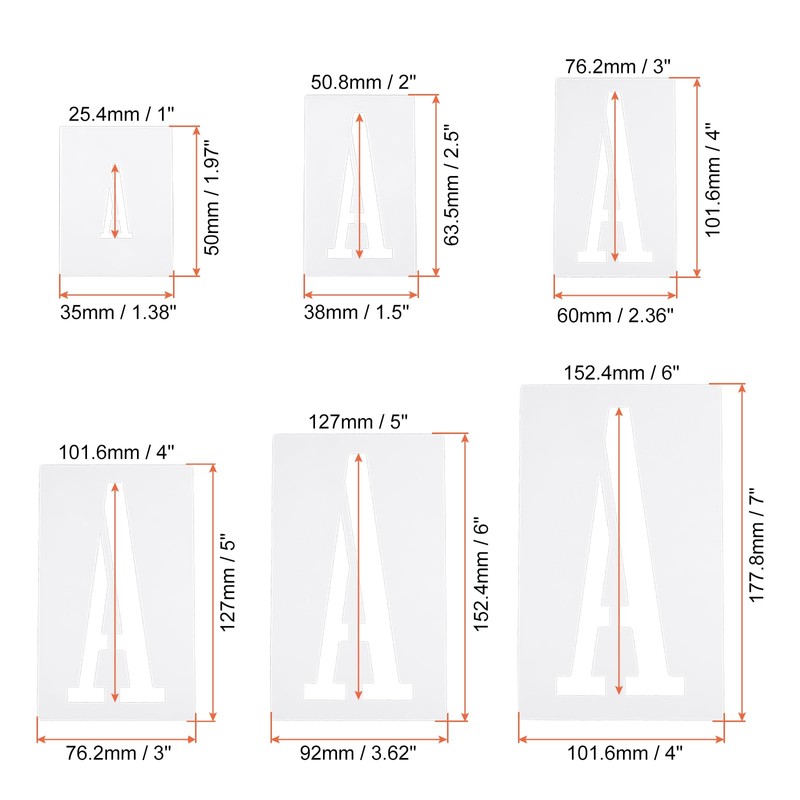 - Color: White; Material: PET; Graphic Height: 76.2mm / 3 inch; Total Size: 101.6 x 60 x 0.28mm / 4 x 2.36 x 0.01 inch(L*W*T); Packing List: 36 x Letter and Number Stencils