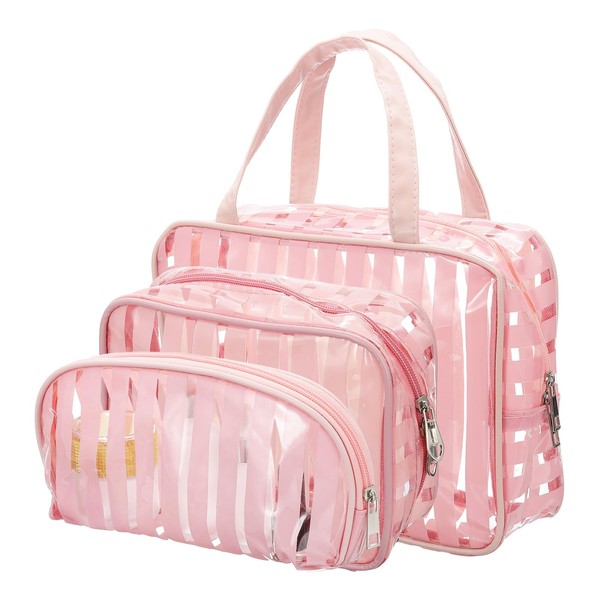 PATIKIL 3 Pcs Clear Makeup Cosmetic Bag, Transparent PVC Travel Toiletry Bag Waterproof Vinyl Organizer Makeup Pouch with Zipper and Handle Strap for Women Men Airport Airline, Pink