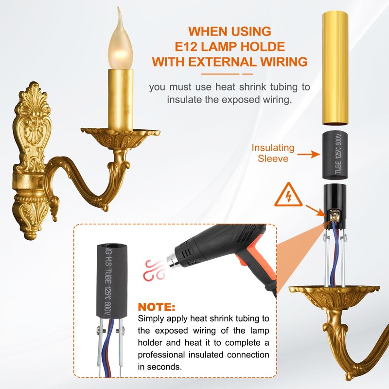 • How to use heat shrinkable flame retardant insulating tube: Simply slide the heat shrink tubing onto the wiring on the E12 keyless socket and heat it. A professional insulating connection can be completed in seconds.