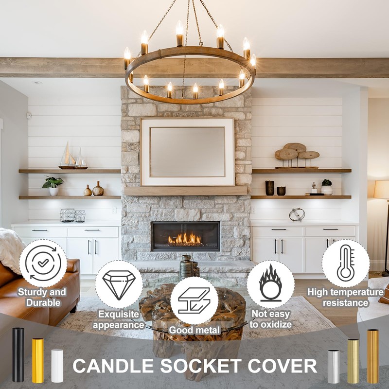 • The candle socket cover is suitable for standard E12 chandelier/candelabra sockets. Decorate your lamps with this sleeve, you can refresh old lamps, enhance the appearance of your chandeliers and lamps, and it is very suitable for repairing and upgrading damaged E12 candle sleeves. Widely used to decorate various chandeliers, candle lamps, crystal lamps, wall lamps and other lighting fixtures.