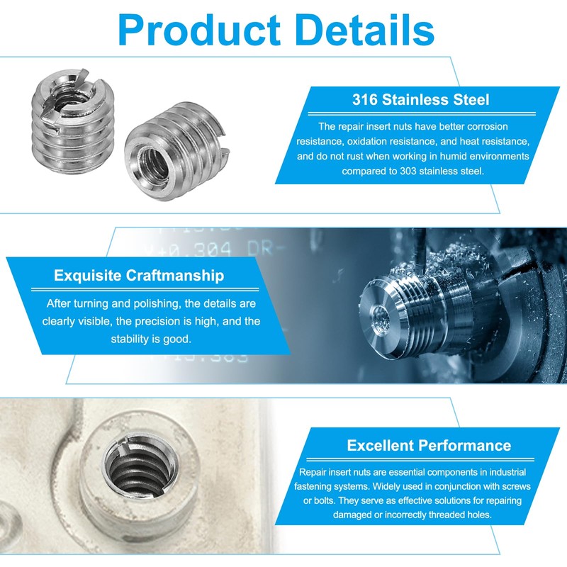 - Advantage: Constructed from 316 stainless steel, the repair insert nuts have better stability, corrosion resistance, oxidation resistance, strength, and heat resistance, and do not rust when working in humid environments compared to 303 stainless steel. Even in challenging environments, they maintain optimal functionality and longevity.