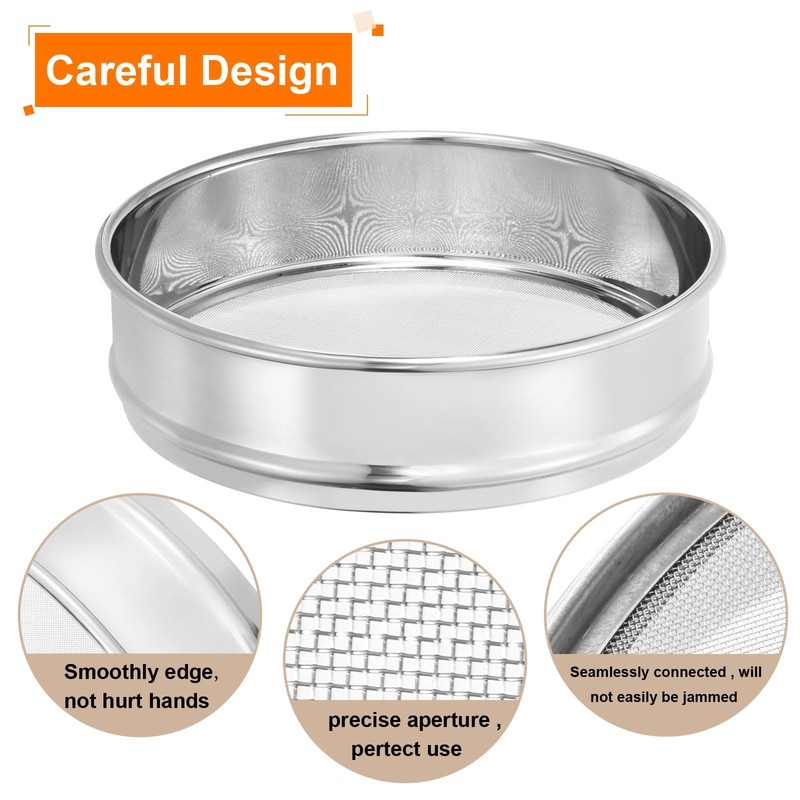 - Careful Design: The test sieve bottom edge pressing is smooth, the screen is not exposed will not sticky, the screen frame and screen are seamlessly connected so will not easily jammed and is easy to clean, can be used repeatedly, more efficient